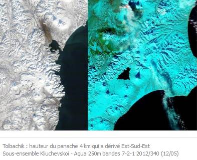L'éruption qui se poursuit est de forte intensité. La météo, maintenant dégagée permet de voir sur les webcams la présence d'un panache éruptif qui plafonne à une altitude estimée par le KVERT à 4000m, emporté vers le sud-est (voir l'image MODIS prise ce matin. L'anomalie thermique relevée hier par le MODVOLC est maintenant moins large (2 km environ) et longue d'à peu près 12 km, ce qui indique qu'elle s'est vraisemblablement canalisée. Le niveau d'alerte aviation est maintenu à l'orange par le KVERT. Sources : MODVOLC; MODIS/NASA; KVERT.